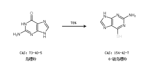 1.通過(guò)鳥(niǎo)嘌呤合成6-硫鳥(niǎo)嘌呤,收率約78%;