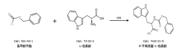 1.通過(guò)氯甲酸芐酯和L-色氨酸合成N-芐氧羰基-L-色氨酸,收率約10%;