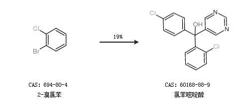 2.通過5-溴嘧啶和2,4-二氯苯甲酮合成氯苯嘧啶醇,收率約34%;