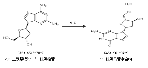 1.通過2,6-二氨基嘌呤-2’-脫氧核苷合成2''-脫氧鳥苷水合物,收率約91%;