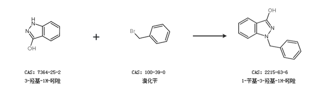 1.通過3-羥基-1H-吲唑和芐基氯合成1-芐基-3-羥基-1H-吲唑,收率約76%;