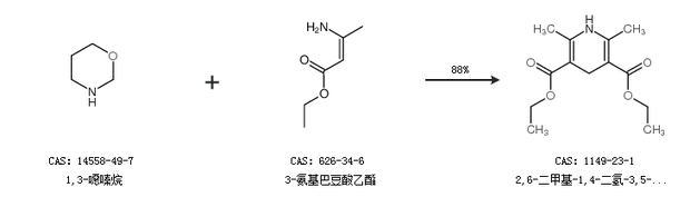 2.通過1,3-噁嗪烷和3-氨基巴豆酸乙酯合成2,6-二甲基-1,4-二氫-3,5-吡啶二羧酸二乙酯,收率約88%;