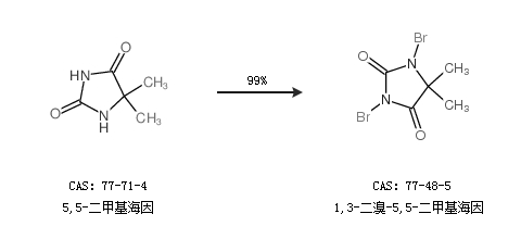 1.通過(guò)5,5-二甲基海因合成1,3-二溴-5,5-二甲基海因,收率約99%;