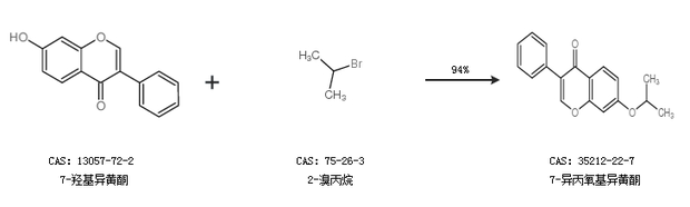 1.通過(guò)7-羥基異黃酮和2-溴丙烷合成7-異丙氧基異黃酮,收率約94%;