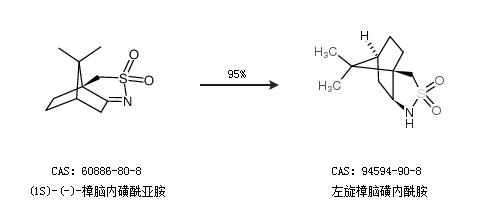 1.通過(guò)(1S)-(-)-樟腦內(nèi)磺酰亞胺合成左旋樟腦磺內(nèi)酰胺,收率約95%;