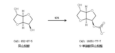 1.通過(guò)異山梨醇合成5-單硝酸異山梨酯,收率約40%;