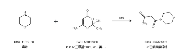 2.通過(guò)嗎啉和2,2,6-三甲基-4H-1,3-二英-4-酮合成N-乙酰丙酮嗎啉,收率約87%;