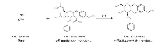 1.通過甲醇鈉和4-甲氧苯基2,4,6-三-O-乙酰-3-O-芐基-β-D-吡喃葡萄糖苷合成4-甲氧苯基3-O-芐基-β-D-吡喃葡萄糖苷,收率約87%;
