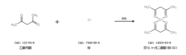 1.通過(guò)乙酰丙酮和鋅合成雙(2,4-戊二酮酸)鋅(II),收率約89%;