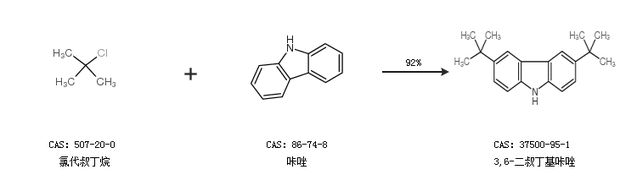 1.通過氯代叔丁烷和咔唑合成3,6-二叔丁基咔唑,收率約92%;
