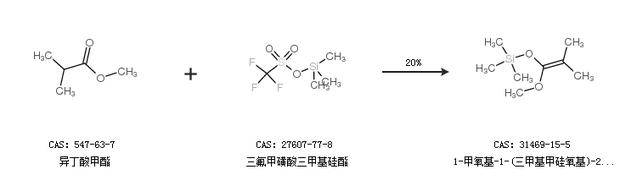 2.通過異丁酸甲酯和三氟甲磺酸三甲基硅酯合成1-甲氧基-1-(三甲基甲硅氧基)-2-甲基-1-丙烯,收率約20%;