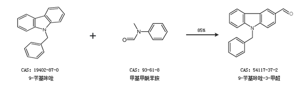 2.通過(guò)9-芐基咔唑和甲基甲酰苯胺合成9-芐基咔唑-3-甲醛,收率約85%;