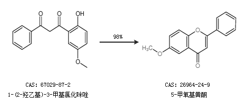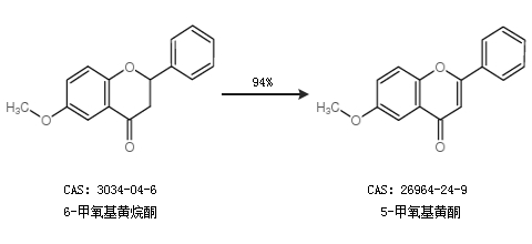 1.通過(guò)6-甲氧基黃烷酮合成5-甲氧基黃酮,收率約94%;