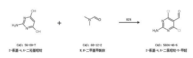 2.通過2-氨基-4,6-二羥基嘧啶和N,N-二甲基甲酰胺合成2-氨基-4,6-二氯嘧啶-5-甲醛,收率約82%;