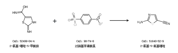 1.通過2-氨基-噻唑-5-甲酰胺和對(duì)硝基苯磺酰氯合成2-氨基-5-氰基噻唑