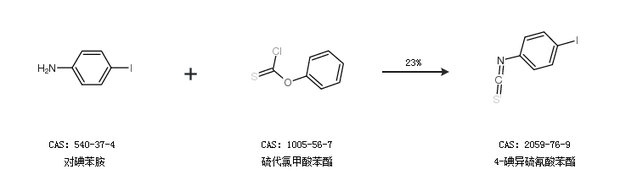 1.通過對碘苯胺和硫代氯甲酸苯酯合成4-碘異硫氰酸苯酯,收率約23%;