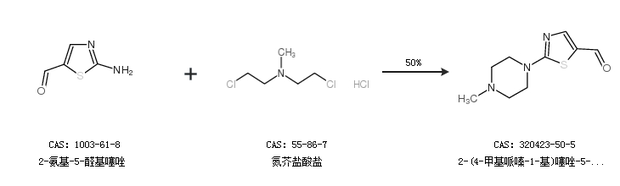 1.通過2-氨基-5-醛基噻唑和氮芥鹽酸鹽合成2-(4-甲基哌嗪-1-基)噻唑-5-甲醛,收率約50%;