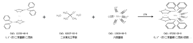 2.通過1,1''-雙(二苯基膦)二茂鐵、二水氧化三甲胺和六羰基鉬合成(1,1’-雙(二苯基磷)二茂鐵)四羰基鉬,收率約17%;