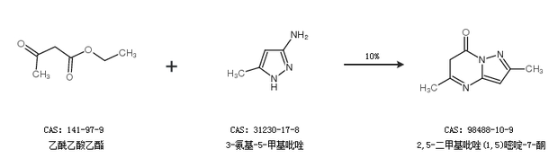 1.通過(guò)乙酰乙酸乙酯和3-氨基-5-甲基吡唑合成2,5-二甲基吡唑(1,5)嘧啶-7-酮,收率約10%;